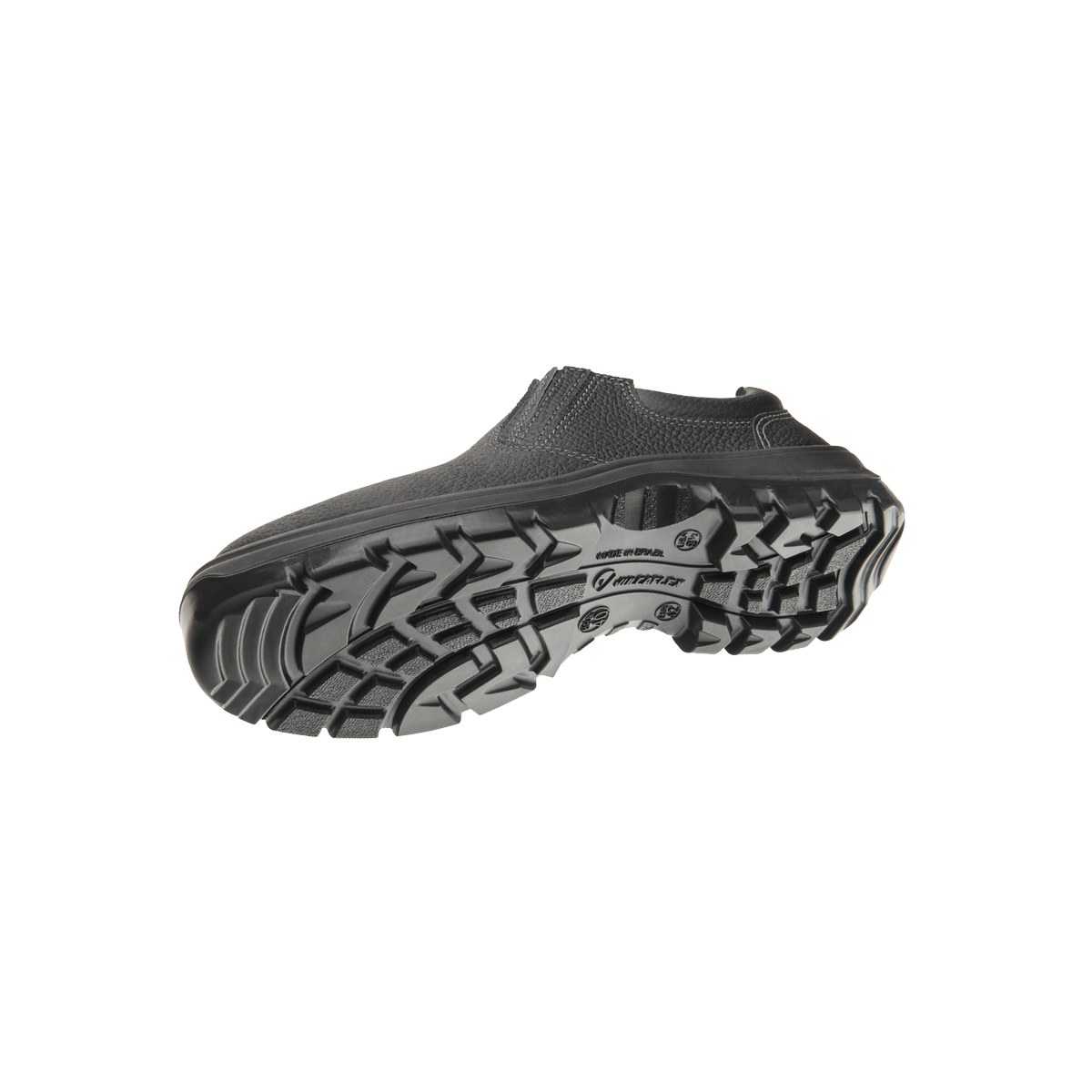 O solado em PU bidensidade tem sistema de absorção de impacto, sendo injetado diretamente no cabedal.